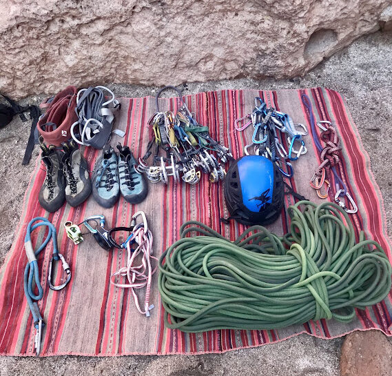 • Equipo completo de escalada: Cascos, arneses, cintas expreses, mosquetones, cuerda,  zapatillas de escalada, dispositivos de aseguramiento Gri Gri y ATC, entre otros. Snack: frutas, chocolate, barra de cereal, sándwich.