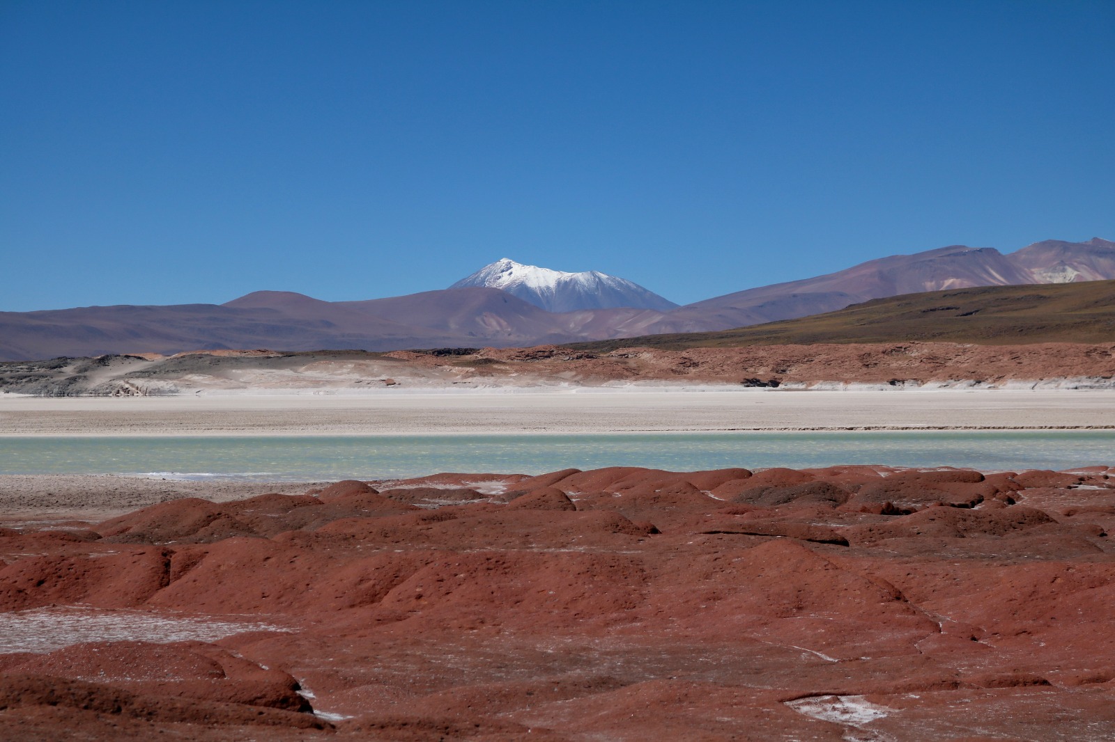 Para llegar a Piedras Rojas, también conocido como el Salar de Aguas Calientes, ascenderemos en vehículo hasta los 4.000 metros de altitud. Desde allí realizaremos una caminata de aproximadamente una hora (ida y vuelta), recorriendo un paisaje único de rocas rojizas, lagunas de intensos colores y salares, que contrastan con los volcanes que dominan el horizonte.